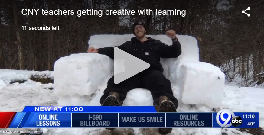Thursday, March 26, 2020—Central New York teachers are getting creative in their efforts to keep kids learning while schools are closed during the COVID-19 pandemic. In the video above, Lucas Cognetti, a first-grade teacher at Syracuse Academy of Science and Citizenship Charter School on Valley Drive, shows how he is being creative. He and his fellow teachers are using social media as a platform to connect with the kids. Cognetti’s special classroom reading chair is still in the classroom, so he made his own out of snow! He then shared the story “How to Make a Shark Smile!”