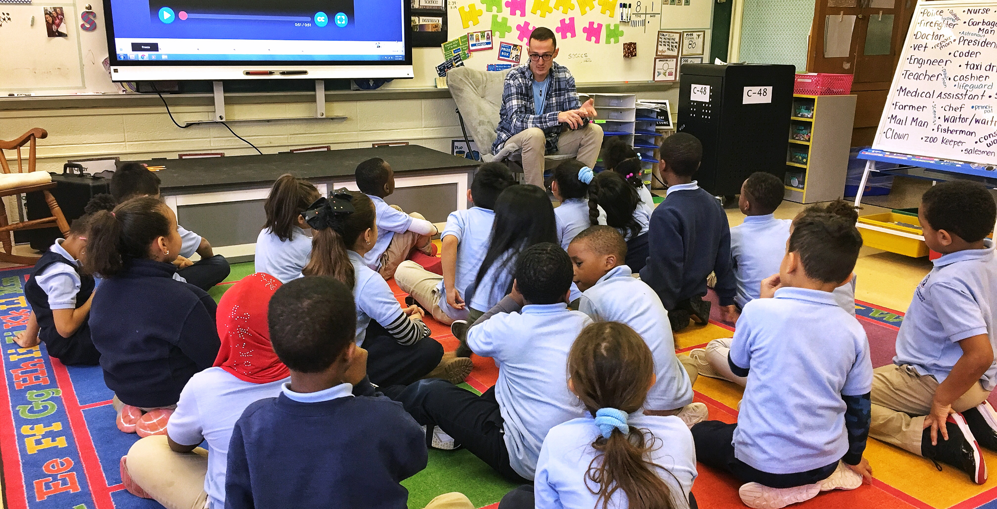 On Thursday, January 17, 2019, Andy Vadnais, a software engineer from Syracuse, talked to Citizenship Academy first graders about what software engineers do and how coding is used to create games, apps and other things they use every day. Vadnais explained the importance of going to college and how it helped him achieve his career goals.